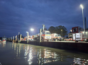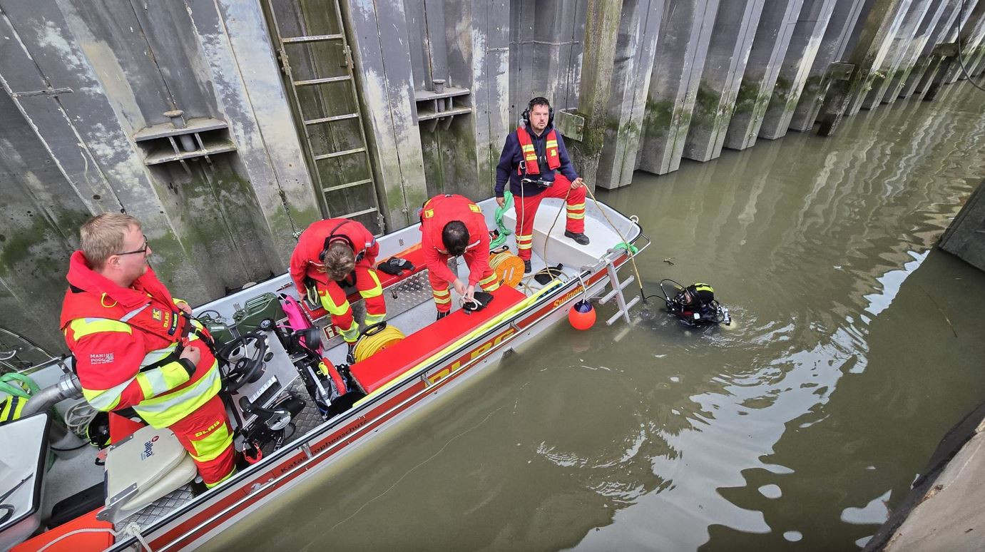 Tauchergruppe: Im Bützflether Industriehafen führten die Einsatztaucher eine Kontrolle am Antrieb einer Elbclearingfähre durch. Angenommenes Szenario war eine mögliche Beschädigung durch Tampen.